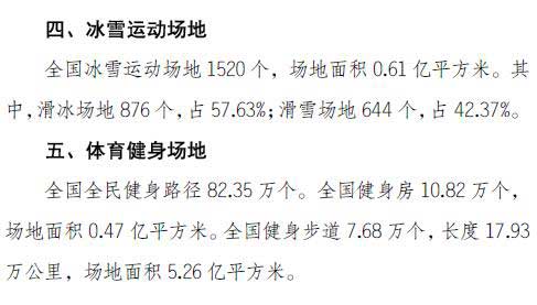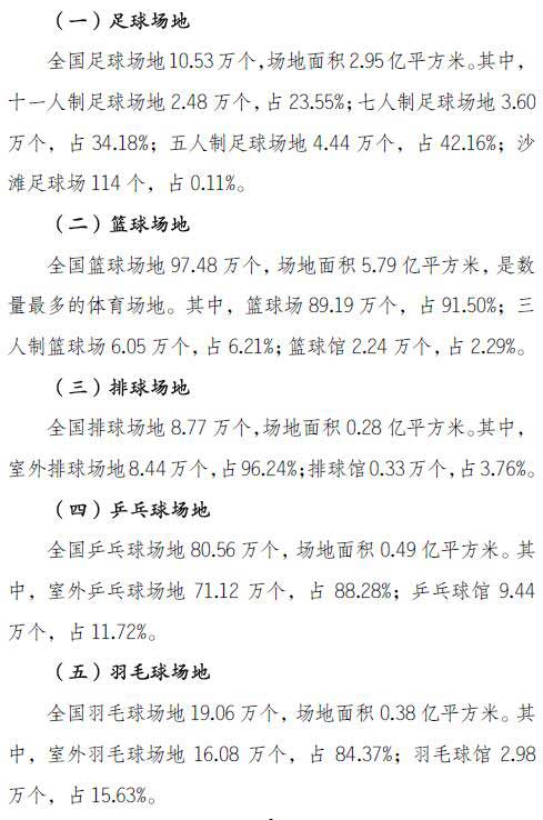 从运动项目类型看,篮球场地97.48万个,全民健身路径82.35万个,乒乓球场地80.56万个,位居各类体育场地数量前三位。其他项目方面,健身步道7.68万个(17.93万公里),足球场为10.53万个,排球场地8.77万个,羽毛球场地19.06万个……以下为《2019年全国体育场地统计调查数据》全文: