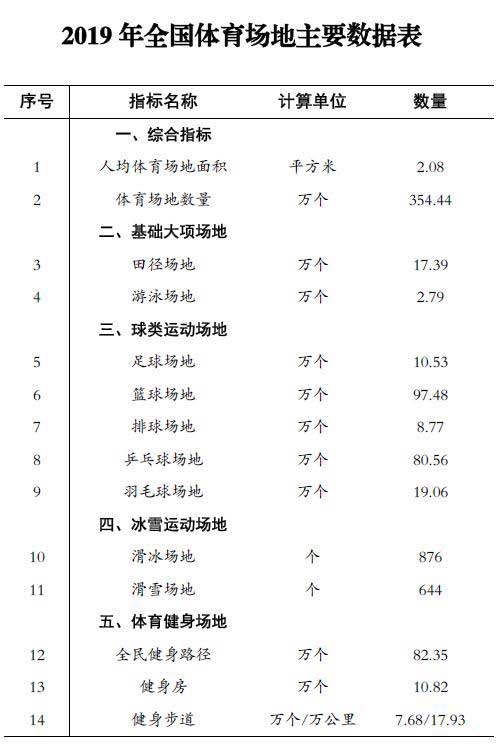 11月2日,国家体育总局经济司公布《2019年全国体育场地统计调查数据》。调查数据显示,截至2019年底,全国体育场地共354.44万个,体育场地面积共29.17亿平方米,人均场地面积为2.08平方米。(较2018年同期数据:全国体育场地共316.20万个,体育场地面积共25.94亿平方米,人均场地面积为1.86平方米,数据保持持续上涨。)